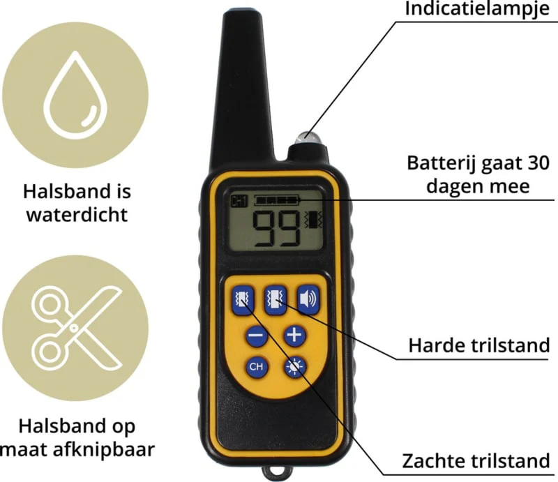 De afstandsbediening is zeer gebruiksvriendelijk en kan meerdere halsbanden bedienen, afhankelijk van het gekozen model (eenpersoons, tweepersoons, of driepersoons).