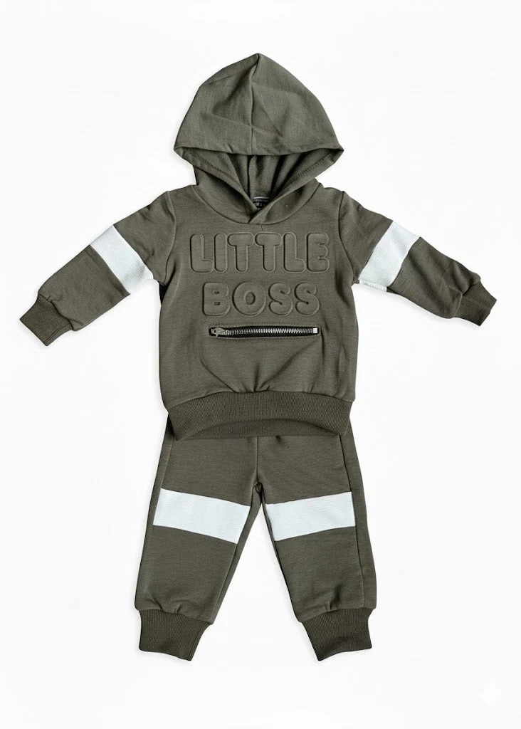 Op de voorkant staat een stoere 3D Tekst met ‘Little Boss’ en de opvallende witte strepen op mouwen en pijpen geven het geheel een sportieve look.
