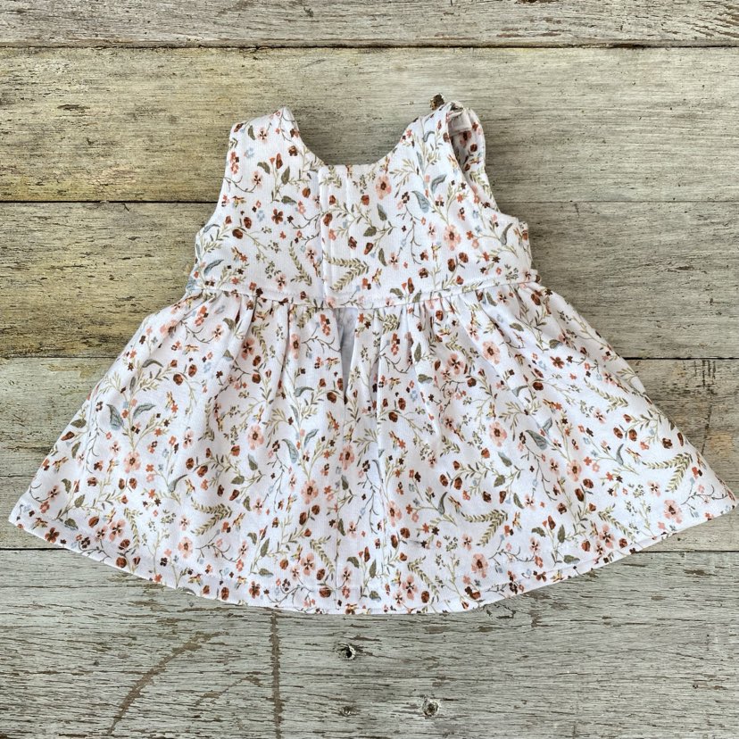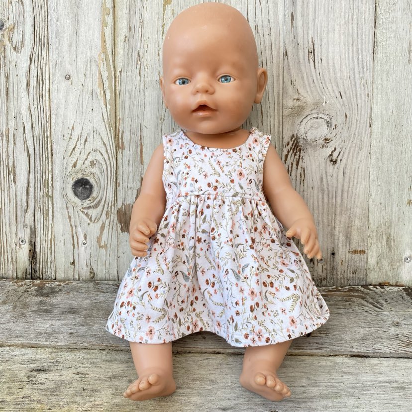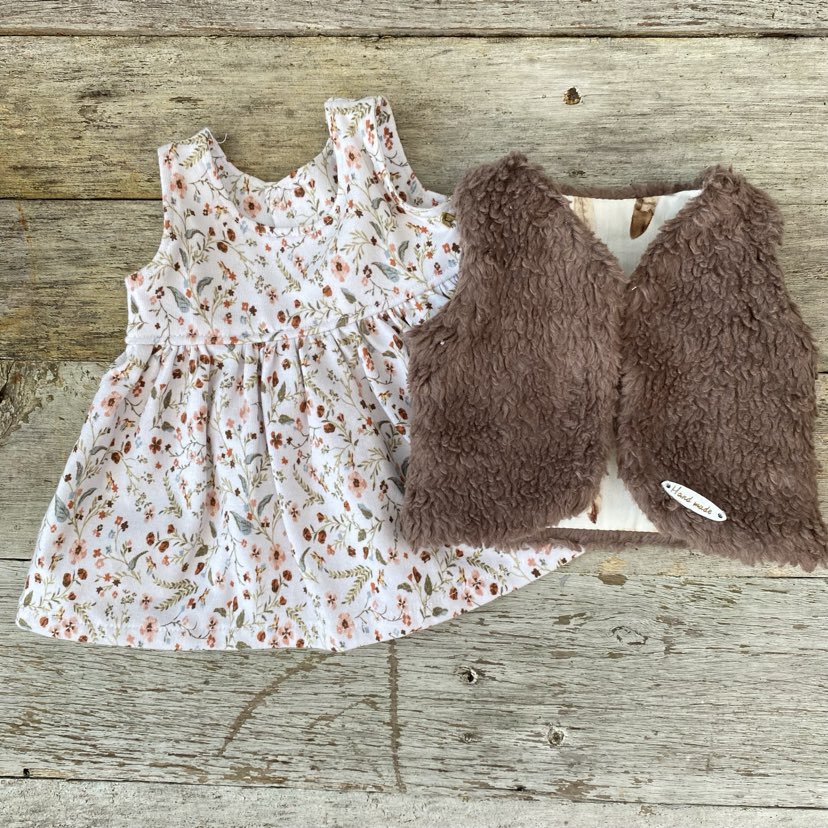 Jurkje Kleine Bloemetjes met Giletje is leuk om te geven aan een kleine poppen vader of moeder. Het jurkje kan makkelijk aangetrokken worden over het hoofd van de pop. Het jurkje kun je sluiten aan de achterzijde door middel van het klittenband. Het Giletje kan je aantrekken door de armpjes naar achteren te schuiven.