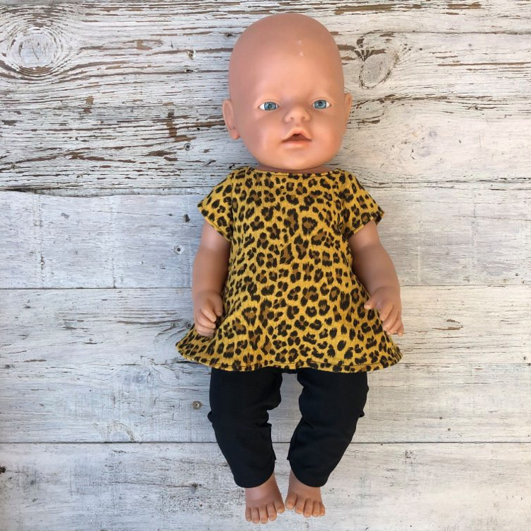 Jurkje met legging panterprint okergeel is leuk om te geven aan een kleine poppen vader of moeder.