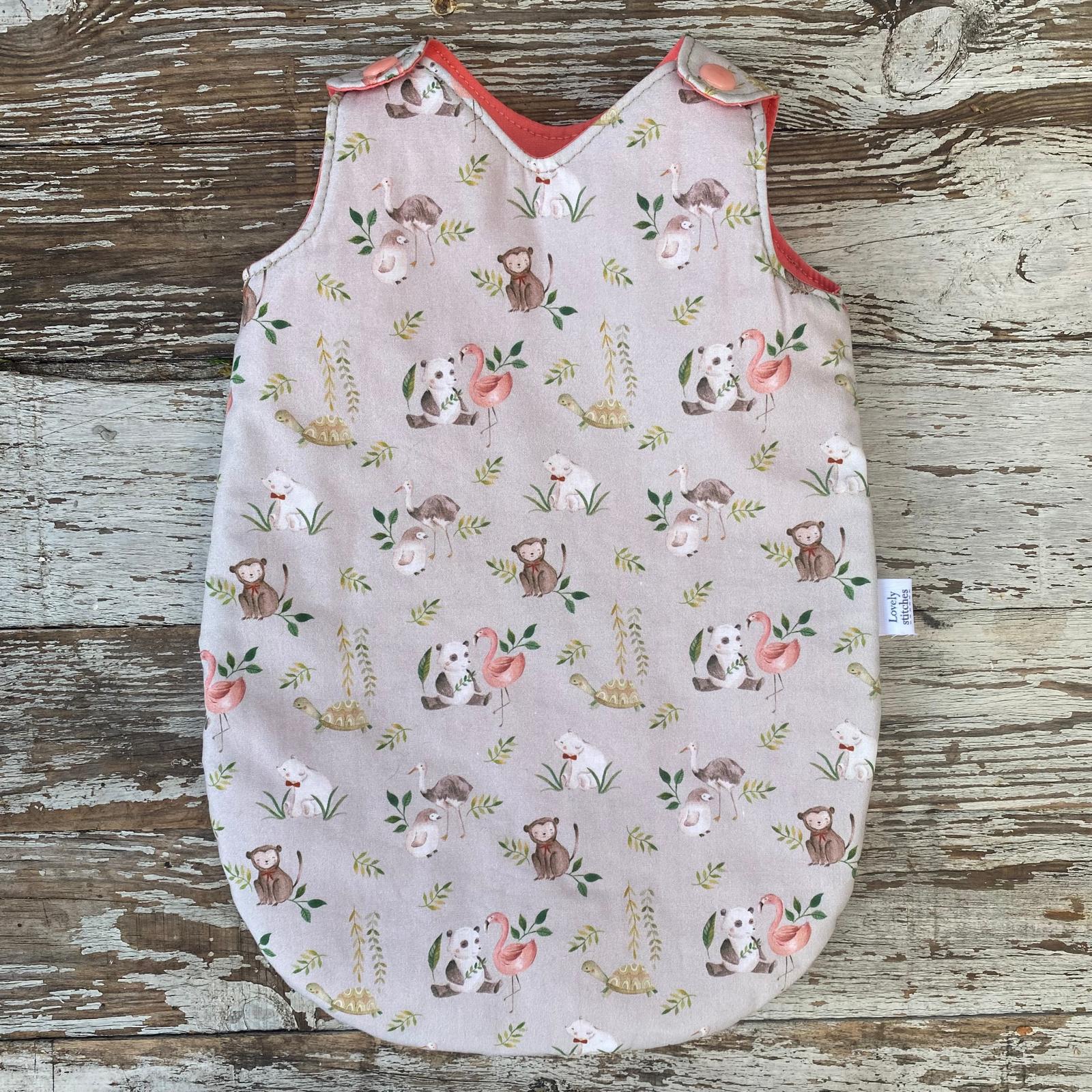 Ben je op zoek naar een mooi en praktisch poppen slaapzakje taupe jungle mt 43? Dit handgemaakte slaapzakje van Lovely Stitches is speciaal ontworpen voor poppen van mt 43 zoals Baby Born en vergelijkbare modellen. Dankzij de combinatie van zachte materialen en een speelse print is dit slaapzakje ideaal voor kinderen die graag rollenspellen spelen en hun pop willen verzorgen.