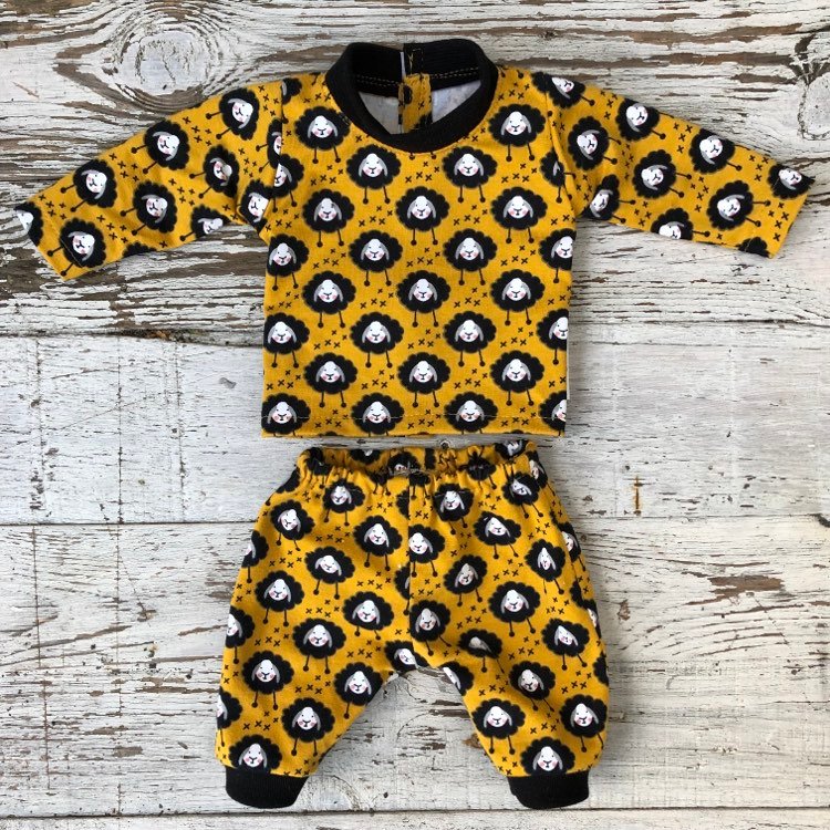 Pyjama schaapjes okergeel is een leuk setje om te geven aan een kleine poppen vader of moeder.